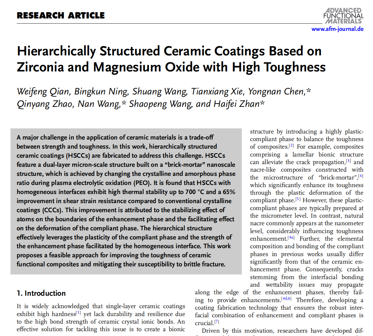 近日,我院博士生钱伟峰等人在导师陈永楠教授的指导下,在材料科学领域国际期刊《Advanced Functional Materials》(中科院1区Top期刊,IF 18.5)发表论文“Hierarchically Structured Ceramic Coatings based on Zirconia and Magnesium Oxide with High Toughness”。陈永楠教授为第一通讯作者,yl7703永利集团为第一通讯单位。论文信息陶瓷材料应用中的一个主要挑战是强度和韧性之间的权衡。此研究通过构建多尺度异构结构陶瓷涂层(HSCC)...