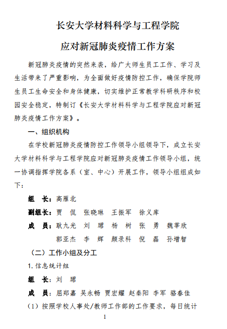 上午7:00,《yl7703永利集团yl7703永利集团应对新冠肺炎疫情工作方案》正式出台。随着疫情迅速蔓延,材料学院在第一时间积极响应,迅速成立材料学院抗击新冠疫情领导小组,下设分工明确,责任到人的七个专项工作组,包括信息统计组、学生教育疏导组、教师教育疏导组、教学管理组、宣传与舆情管控组、督查督导组、志愿服务组,落实落细党中央、陕西省、西安市及学校的各项任务要求,认真履行学院的各项职责要求。