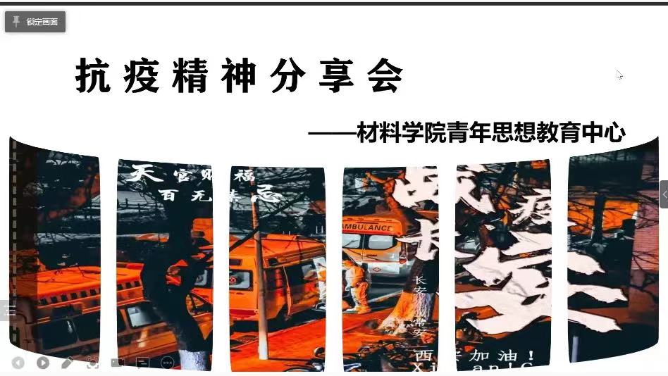 19:00,由材料学院青年思想教育中心马熠航和张玮老师举办的“抗疫精神分享会”正式拉开帷幕,学院邀请到10位同学代表分享自己的抗议故事,他们讲到自己穿上防护服后的自豪感,自己作为志愿者坐在台阶上吃早餐的故事,讲到自己连续送餐时的疲惫,但是,他们都无怨无悔。有一位女同学身体不好,但还是坚持为同学们服务,她说:“因为被温暖照料过,所以也想给大家带来温暖;因为淋过雨,所以想为他人伞”。这些志愿者们,本来在这个年纪还是父母的“宝贝”,却穿上防护服成为了大家的“守护神”。正是因为有这么多人挺身而出,才能守护我长安“常安”。