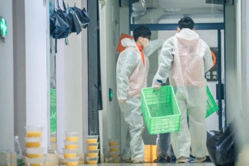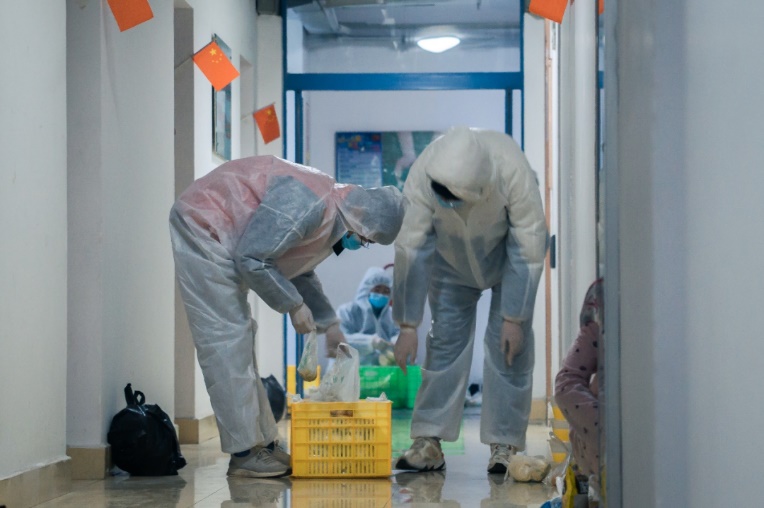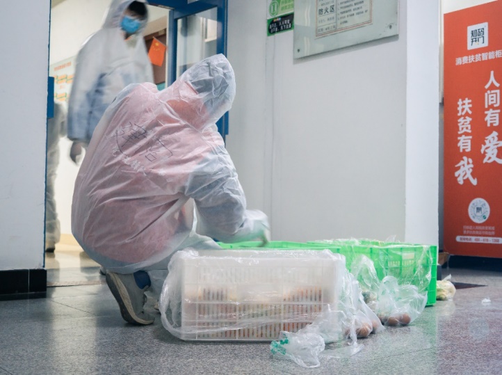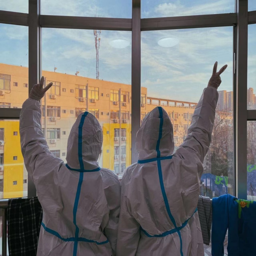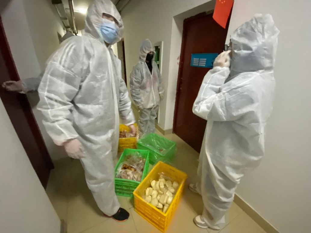 做志愿者给同学们送饭,是个骄傲的事。虽说端着箱子跑上跑下很累,因为防护服的不透气汗直往下淌不好受,但是同学开门取到餐的那一声“谢谢”“辛苦”,带给我们的愉悦和满足很不一般。清早天边一角粉红色的朝霞和二十几个人白色的背影,负责人卓越的领导能力和成员们抢着干活的冲劲,也让我深深铭记着。