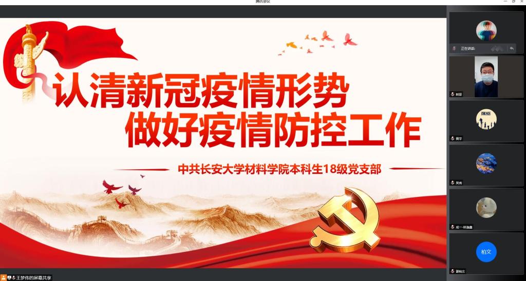 为深入学习3月17日中共中央政治局常务委员会会议上,习近平总书记关于分析新冠肺炎疫情形势,部署从严抓好疫情防控工作的重要指示精神,贯彻落实学校《关于做好校园疫情防控工作的通知》要求,材料学院本科生18级党支部于3月22日开展“认清新冠疫情形势,做好疫情防控工作”线上主题教育活动,宣讲疫情防控知识,布置近期支部防疫工作,强调党员防疫职责。