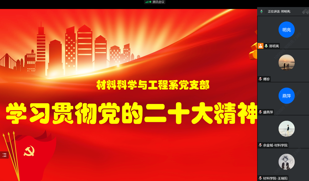 为深入学习宣传贯彻党的二十大精神,坚持不懈用习近平新时代中国特色社会主义思想铸魂育人,2022年11月10日下午,材料科学与工程系党支部在北校区材科系办举行党的二十大精神专题学习研讨会。会议由支部书记耿九光主持,材料科学与工程系全体教师线上、线下同步参加。