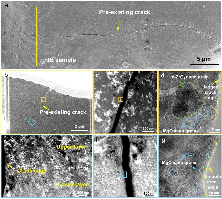 陶瓷材料应用中的一个主要挑战是强度和韧性之间的权衡。此研究通过构建多尺度异构结构陶瓷涂层(HSCC)来应对这一挑战。受天然贝壳启发,研究团队基于“砖-砂”纳米级结构,通过调控强化相(砖)和塑性相(砂)的成分和比例,在膜层中建立了微米级外强内韧的双层结构。研究发现,HSCC具有高达700°C的高相组成和结构热稳定性,与传统晶体涂层相比,其抗剪切应变能力提高了65%。锆原子稳定了增强相的边界,促进了顺应相的变形,使得分层结构能够通过同质相界面有效利用塑性相的变形能力和强化相的强度。这项研究为提高陶瓷功能复合材料的韧性和降低其脆断倾向提出了一种可行的设计和实现方法。