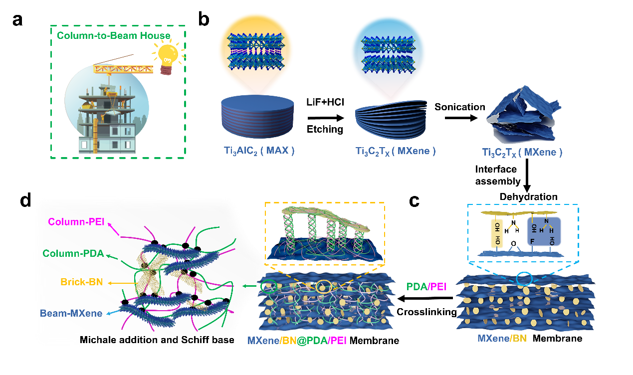 MXene/BN@PDA/PEI膜的制备示意图:(a)具有梁-柱结构的房子,(b) Ti3C2Tx(MXene)纳米片制备,(c) MXene纳米片与BN纳米片组装成2D/2D架构,(d) PDA和PEI通过共价交联反应承担MXene/BN@PDA/PEI复合膜“立柱”部分的作用