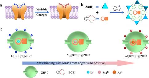 图1. M[BCE]n+@ZIF-7(M=Li+,Mg2+,Al3+)的MOFs膜制备过程。(a)在生物细胞膜中具有可变电荷的离子蛋白通道。(b)在ZIF-7制造过程中原位引入苯并-12-冠-4-醚(BCE)。(c) 通道内冠醚与金属结合后改变了通道电荷,发生由负向正的电荷反转。