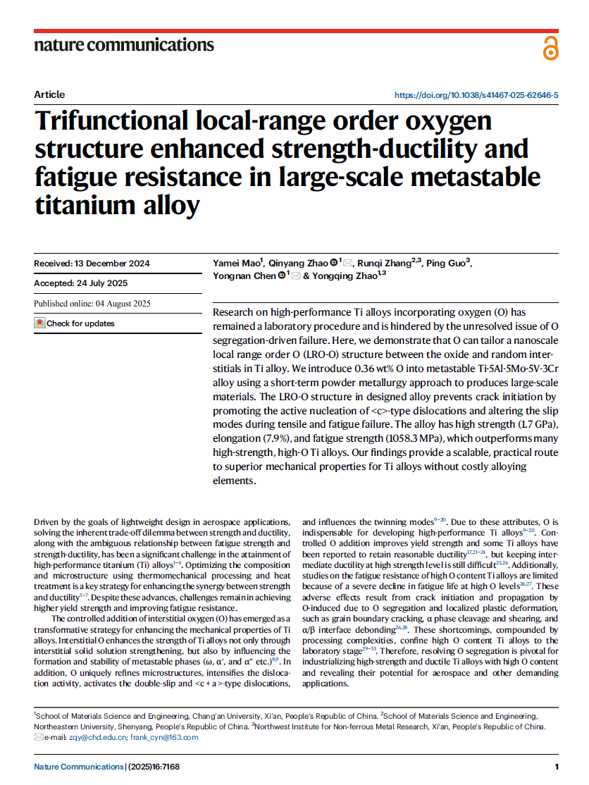 近日,我院赵秦阳教授、陈永楠教授团队在《自然·通讯》(Nature Communications)在线发表了题为“Trifunctional local-range order oxygen structure enhanced strength-ductility and fatigue resistance in large-scale metastable titanium alloy”的研究论文。博士研究生毛雅梅为第一作者,赵秦阳教授、陈永楠教授为共同通讯作者,yl7703永利集团为唯一通讯单位。