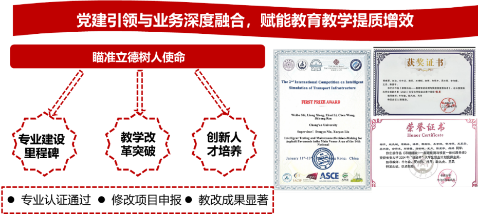 党支部以党建引领,搭建多元平台助力教师成长。一方面,组织专题培训、学术研讨,融合党的先进理论与教育科研方法,提升教师政治素养与专业能力;另一方面,营造良好学术氛围与创新环境,鼓励探索突破,提供发展空间。肖月教授获批陕西省三秦英才青年人才,何锐教授获交通部交通运输青年科技英才,张雷老师获批教育部海外引才专项,盛燕萍教授获陕西省公路学会青年科技奖,邢明亮和齐琳副教授获评yl7703永利集团优秀教师。