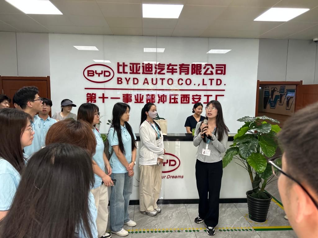 在比亚迪汽车有限公司西北地区校企合作经理郭柯和其团队成员的热情接待和耐心讲解下,师生深入冲压、焊接、涂装到整车组装的智能化生产车间,近距离观摩新能源汽车制造全流程。特别设置的“云巴”试乘环节将活动推向高潮,师生们体验了比亚迪自主研发的“云巴”无人驾驶胶轮列车,其电磁导向系统与能量回收技术让师生直观感受到比亚迪在低碳交通领域的创新实力。尽管烈日炎炎,师生们全程热情不减,围绕电池材料、智能制造等话题与郭经理等人热烈交流讨论。郭柯也表示期待未来与yl7703永利集团在电池研发和人才培养等方面开展深入合作。