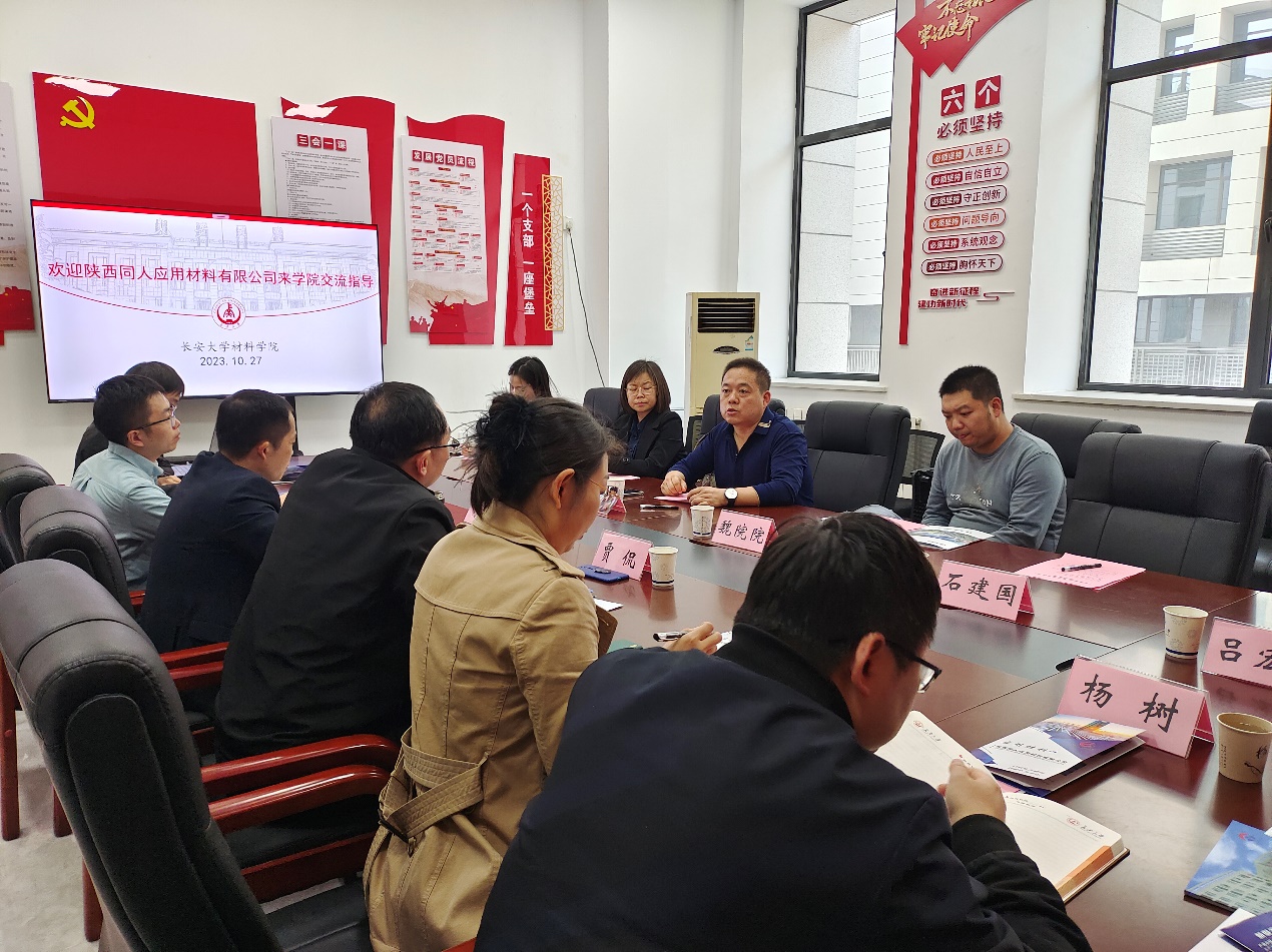 10月27日下午,我院与陕西同人应用材料有限公司开交流座谈会,陕西同人应用材料有限公司董事长兼总经理曹海涛、总经理助理刘颖等一行四人,材料学院院长肖月、副书记兼副院长贾侃、院对外合作交流中心主任齐琳、院综合改革办公室主任何锐、院党委委员材科系主任耿九光,材料学院相关方向老师参加了此次座谈会。会议由贾侃副书记主持。
