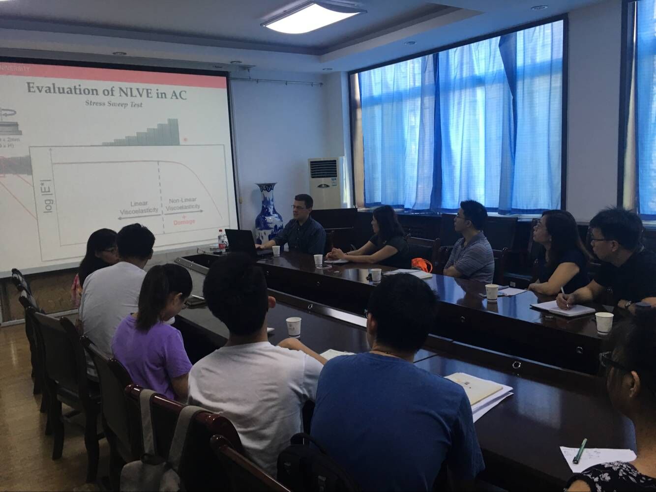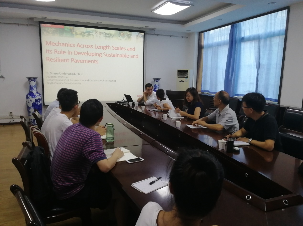报告会上,Underwood副教授从沥青砂浆的成型模拟、沥青混合料多尺度材料变形与疲劳特性、基于黏弹性连续介质损伤理论(VECD)的沥青混合料疲劳特性表征及沥青混合料逐级损伤统一化模型四个方面分别进行详细的介绍,让师生们了解北卡罗莱纳州立大学研究团队近几年最新的研究成果。来访期间,分别于28日和29日,Underwood副教授与我院相关师生就课题研究、SCI论文写作、国际合作等相关科研事宜进行了座谈交流,为进一步合作奠定基础。