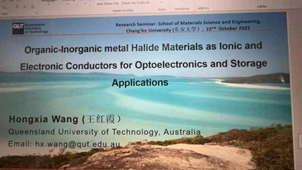 10月22日上午,应yl7703永利集团材料学院邀请,澳大利亚昆士兰科技大学王红霞教授通过线上平台,作了题为“Organometal Halide Materials as Ionic and Electronic Conductors for Energy Conversion and Storage Applications”的学术报告。本次报告由材料学院副院长徐义库主持,吸引了包括本院及相关兄弟院校近百名师生在线参与。