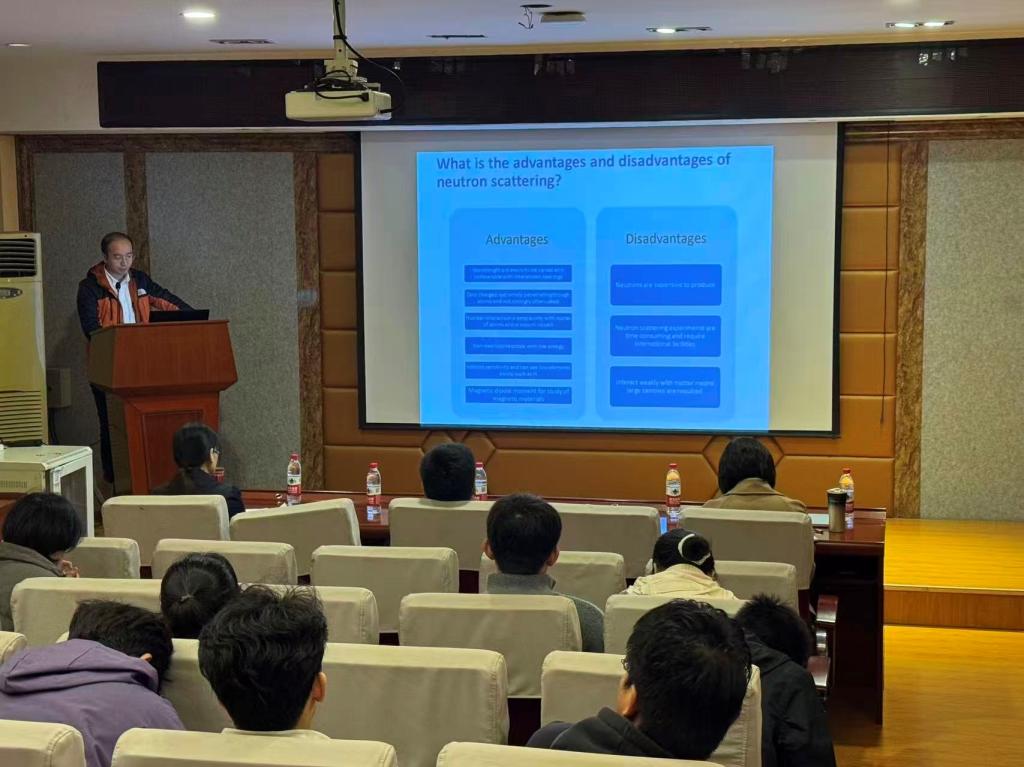 陆智伦教授围绕介电电容器在智能电网、电动汽车等领域的应用背景,系统介绍了其团队在无铅弛豫铁电陶瓷方面的最新研究成果。通过结合同步辐射X射线衍射和透射电子显微技术,从原子尺度揭示了反铁电陶瓷的储能优化机制,创新性地提出了缺陷调控新策略。报告中,陆智伦副教授还深入浅出地讲解了中子散射技术在材料微观结构研究中的独特优势,并以热电材料和磁性材料为例,展示了该技术在凝聚态物理研究中的关键应用。报告内容前瞻、精彩,引起在场师生的浓厚兴趣。